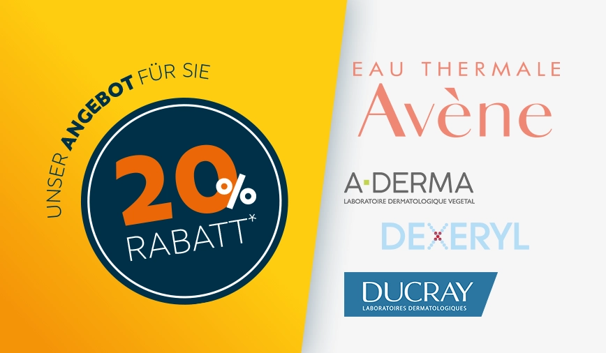 Individuelle Hautanalyse und Beratung und 20 % Rabatt* auf alle vorrätigen Produkte von „Avène“,„Ducray“ und „Dexeryl“. Bitte reservieren Sie online oder vor Ort Ihren Termin.